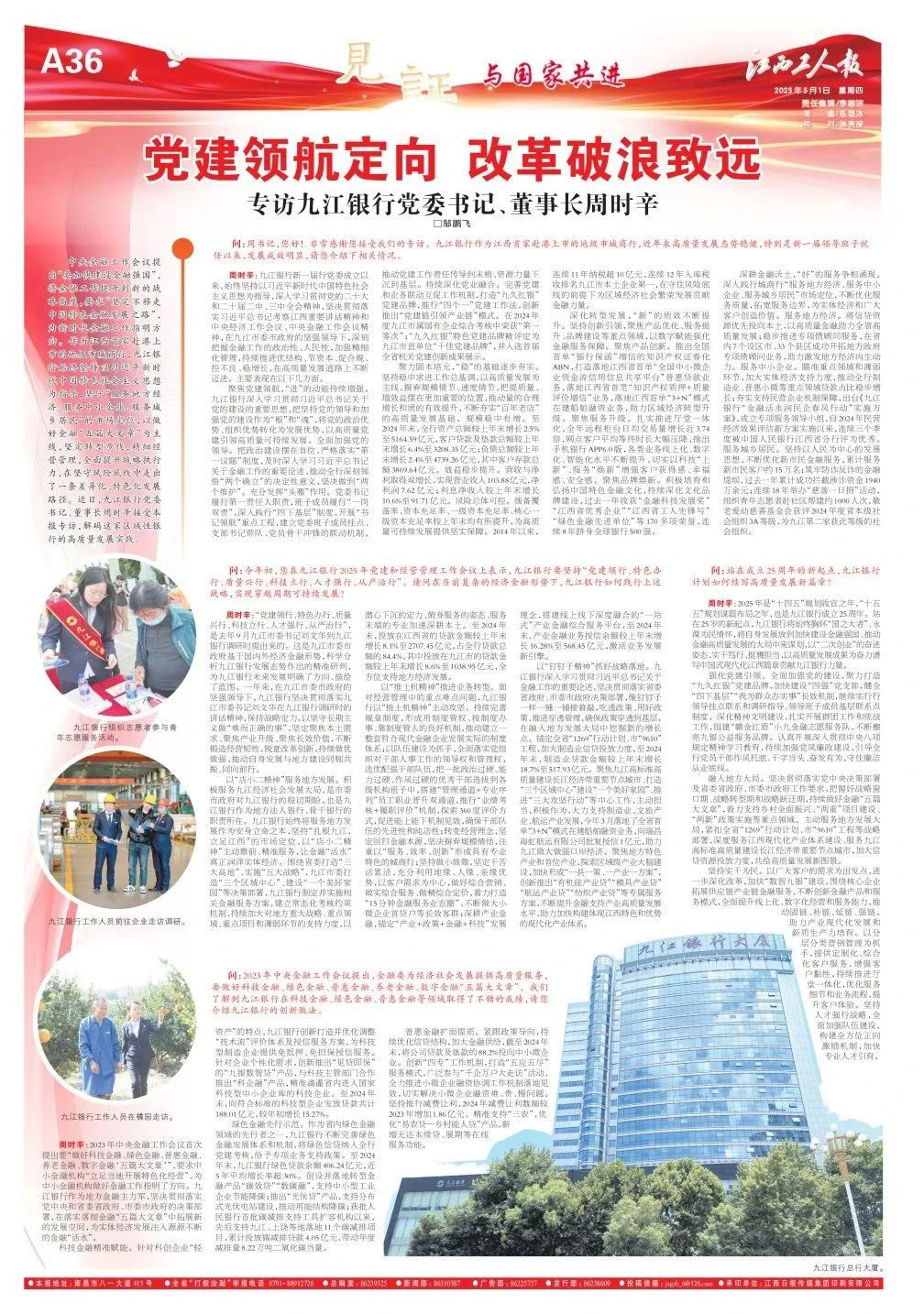 周時辛:2025年是“十四五”規(guī)劃收官之年,“十五五”規(guī)劃謀篇布局之年,也是九江銀行成立25周年。站在25歲的新起點,九江銀行將始終胸懷“國之大者”、永葆為民情懷,將自身發(fā)展放到加快建設(shè)金融強(qiáng)國、推動金融高質(zhì)量發(fā)展的大局中來謀劃,以“二次創(chuàng)業(yè)”的奮進(jìn)姿態(tài),實干篤行、挺膺擔(dān)當(dāng),以高質(zhì)量發(fā)展成果為奮力譜寫中國式現(xiàn)代化江西篇章貢獻(xiàn)九銀力量。