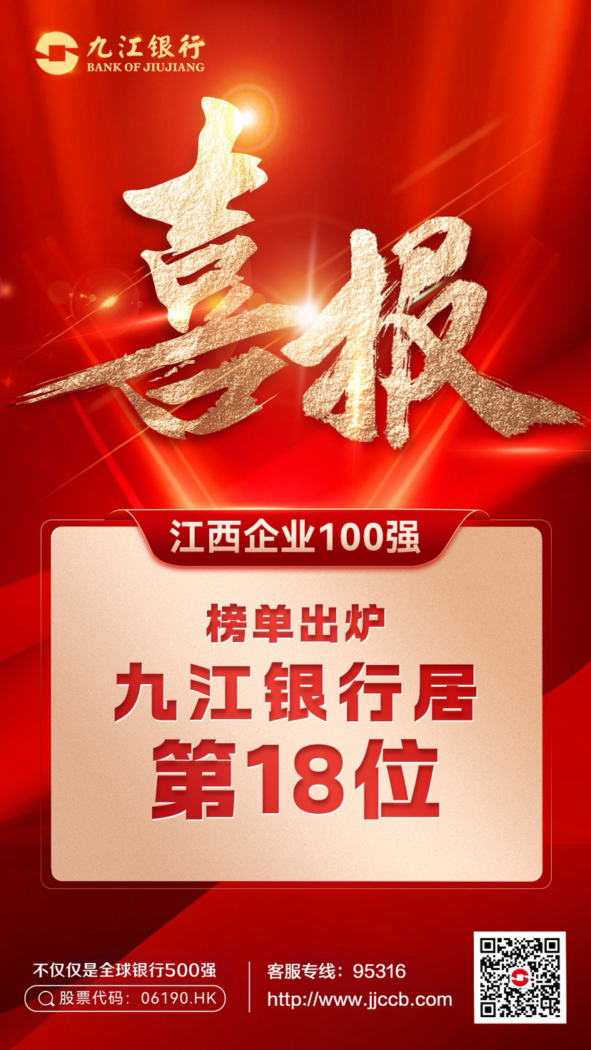 近日,江西省企業(yè)聯(lián)合會、省企業(yè)家協(xié)會正式發(fā)布“2025江西企業(yè)100強”榜單,九江銀行憑借穩(wěn)健的經(jīng)營業(yè)績、卓越的綜合實力再度登榜,位列第18位。這不僅是對九江銀行市場地位與行業(yè)影響力的高度認可,更是對其二十五年來深耕本土、服務地方經(jīng)濟高質量發(fā)展成效的充分肯定。
